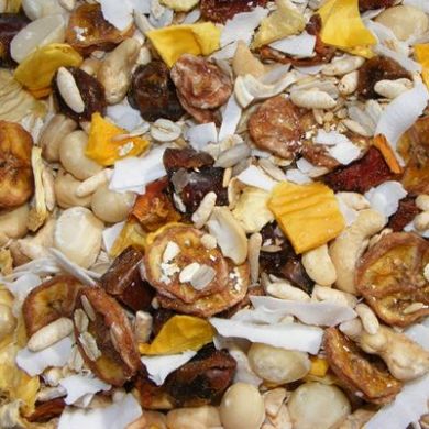 CONTAINS : Dehydrated Banana, Coconut, Dates, Mango, Papaya & Pineapple, Sunflower Kernels, Cashews, Macadamias, Dehulled Oats, Barley, Rice, Oats.