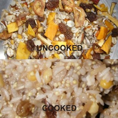 CONTAINS : Basmati Rice, Pasta, Rolled Barley, Dehulled Millet, Yellow Split Peas, Sunflower Kernels, Almonds, Coconut, Sultanas, Dried Apple, Dried Banana, Cinnamon